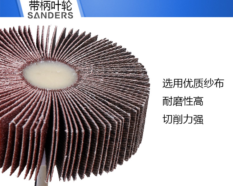 带柄叶轮具有磨削力强,锋利且寿命长,布基的拉力强度高、磨削压力大、效果好,具有装配简易,低噪音,运转顺畅,表面处理效果均匀,切削锋利、加工效率高、不烧伤工件、理化性能稳定、安全性高、连续操作等优点,比手工打磨更能节省时间,是表面处理的首选研磨产品。
