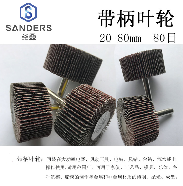 带柄叶轮常常应用于不锈钢、铜、铁、铝、塑料、竹木等金属及非金属材料的各种复杂型面,深空的抛磨和精加工,尤其适用对凹凸面和侧面的行修焊缝、去毛刺、除锈等。